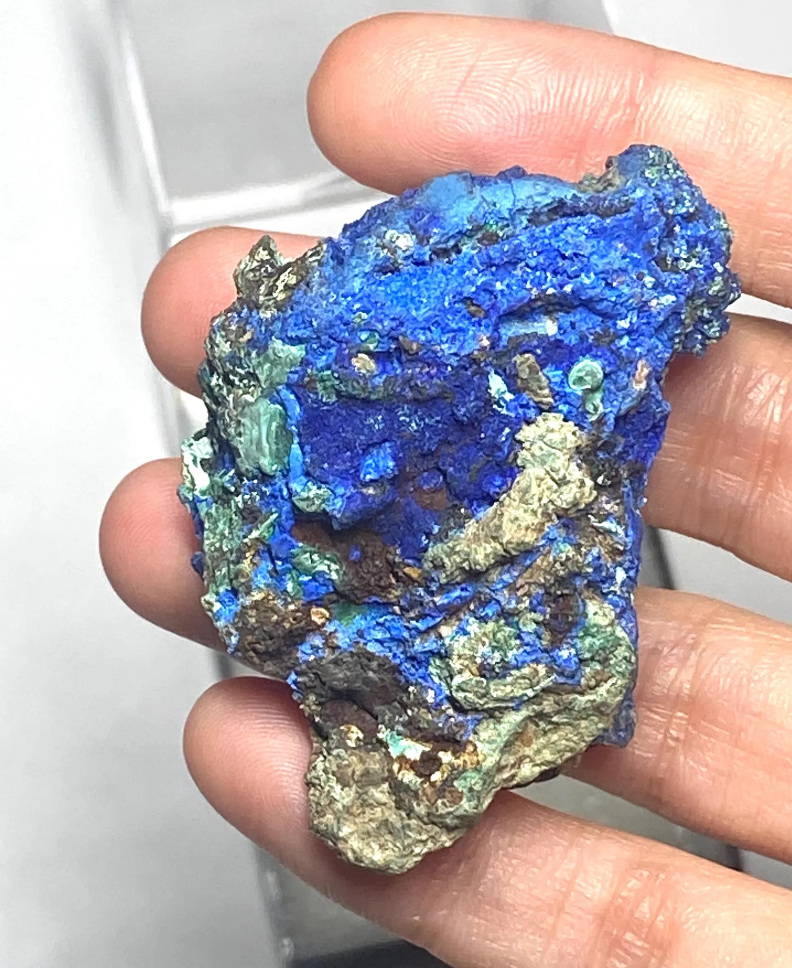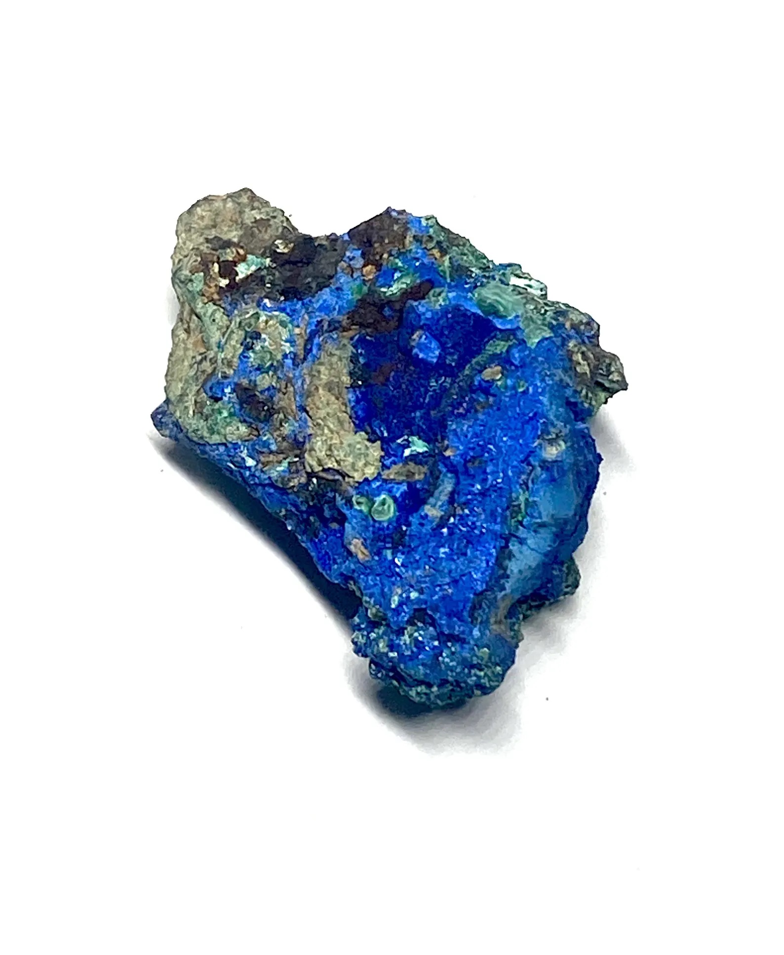 Discover this stunning Azurite and Malachite mineral. This piece is a visually compelling specimen showcasing the natural association of copper carbonate minerals within a contrasting host rock. Deep blue Azurite crystals are intergrown with rich green Malachite, creating strong colour contrast and layered complexity. The specimen displays natural crystal formations with defined surfaces and textural depth. It offers a refined yet dynamic appearance under display lighting. Mineral relationships remain clearly visible. This piece is particularly appealing to collectors who value preserved associations and geological clarity.