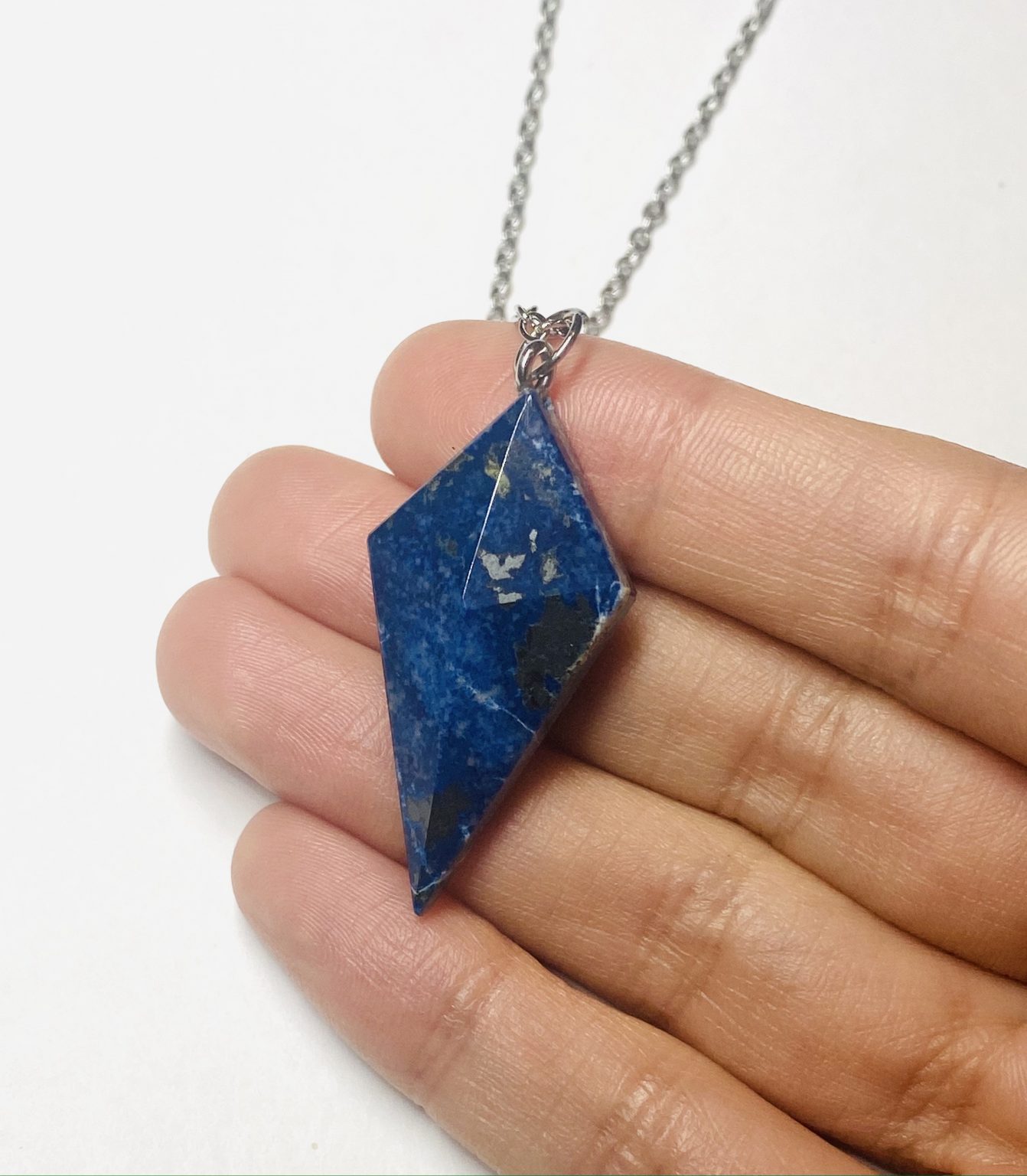 This Chilean Lapis Lazuli necklace showcases deep blue colour with natural golden details. This stone is polished for a smooth, luxurious finish. The crystal features consistent tone and clean shaping for a refined faceted look. Its rich colour adds a bold, premium touch to any outfit. The necklace uses high-quality materials for lasting durability and shine. This piece highlights the beauty of authentic Chilean Lapis Lazuli. The polished surface reflects light with subtle elegance. The stone offers a unique pattern created by natural mineral formation. Suitable for both everyday wear and special occasions.