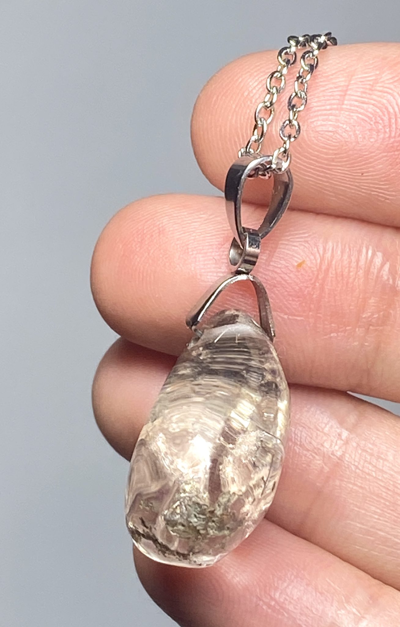 This unique Chlorite and Rutile Inclusion Quartz necklace features a polished crystal pendant with rare, intricate internal formations. Known as Phantom Quartz, it contains soft brown Chlorite and dark Rutile inclusions suspended within clear quartz. These create miniature, landscape-like patterns that are unique to this specimen. This pendant displays natural variations in colour, pattern, and internal structure. Every angle offers a new detail to admire. The polished surface enhances clarity while preserving the stone’s natural character. Handcrafted with care, the pendant highlights the contrast between translucent quartz and layered mineral formations. This necklace is perfect for collectors or anyone seeking a singular, visually striking piece. Its elegant proportions and smooth finish allow it to be worn as a sophisticated statement piece. Showcase the rare beauty of natural crystal growth in this Chlorite and Rutile Inclusion Quartz necklace.