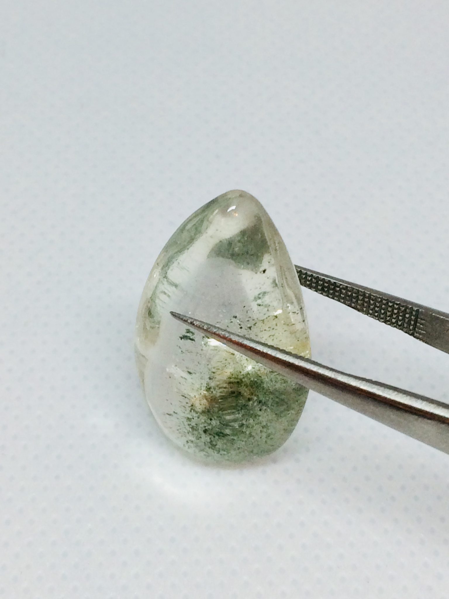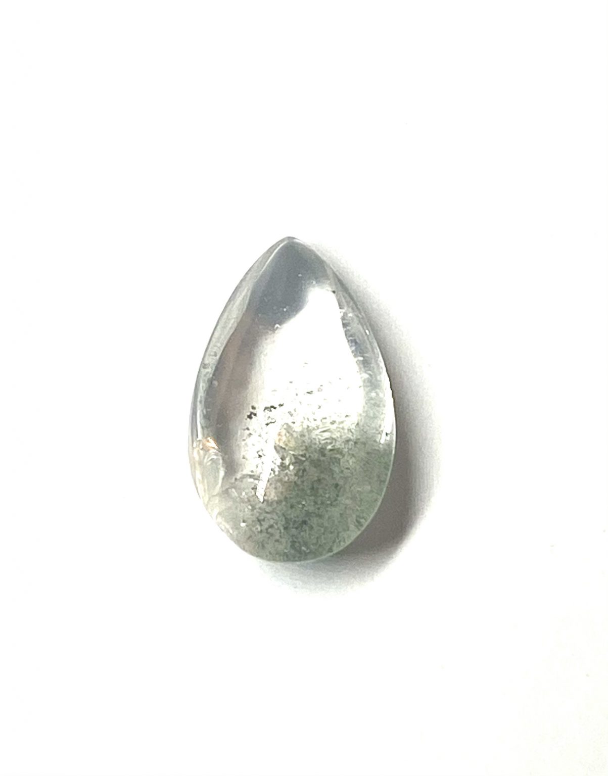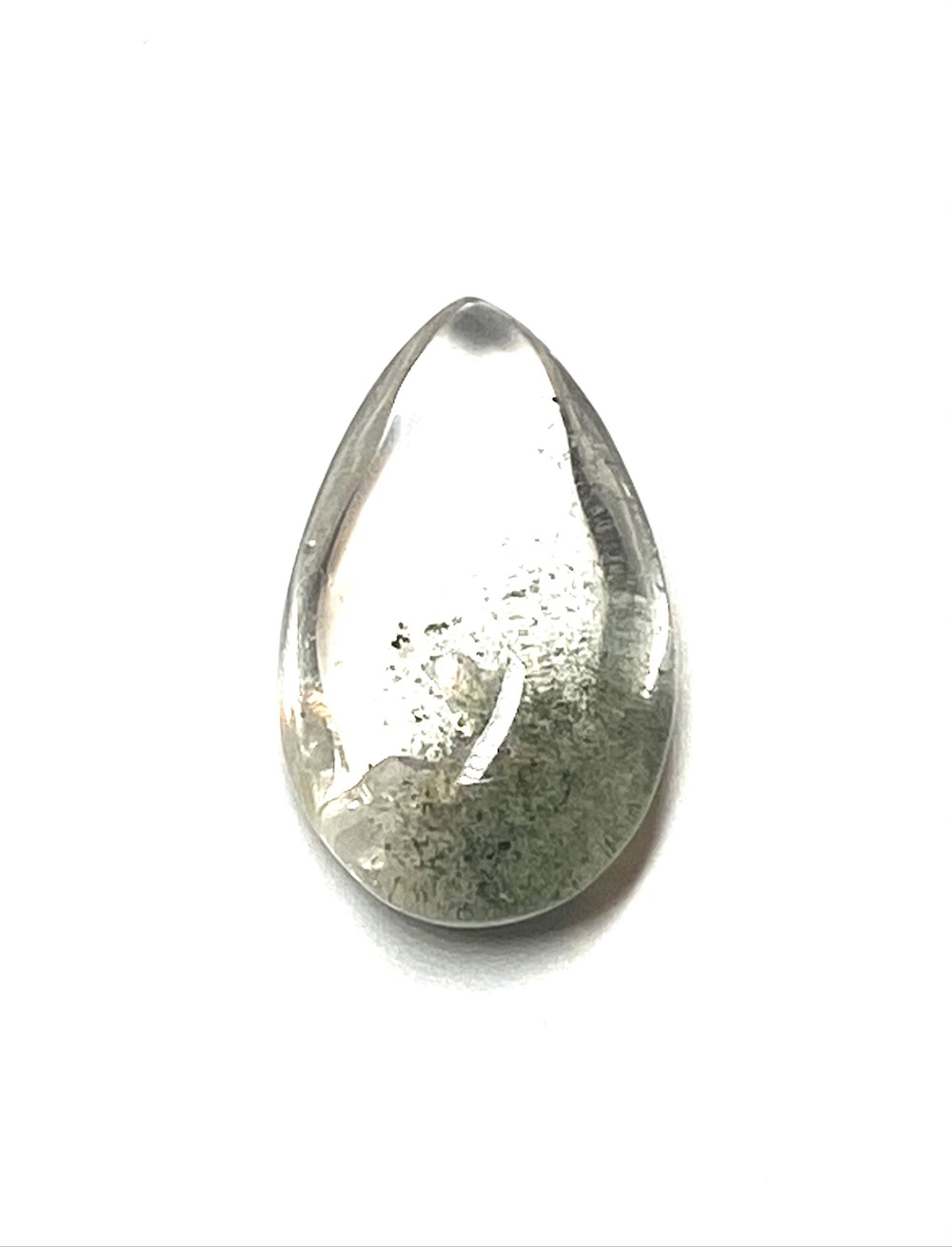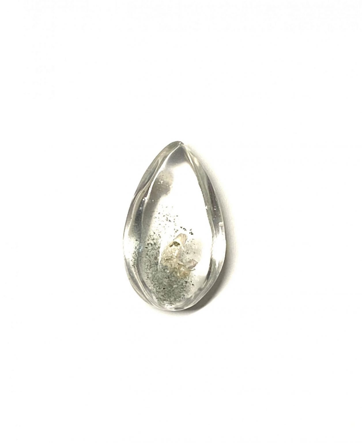 Polished quartz teardrop with green chlorite inclusions. Smooth crystal highlighting internal mineral patterns and natural formations.