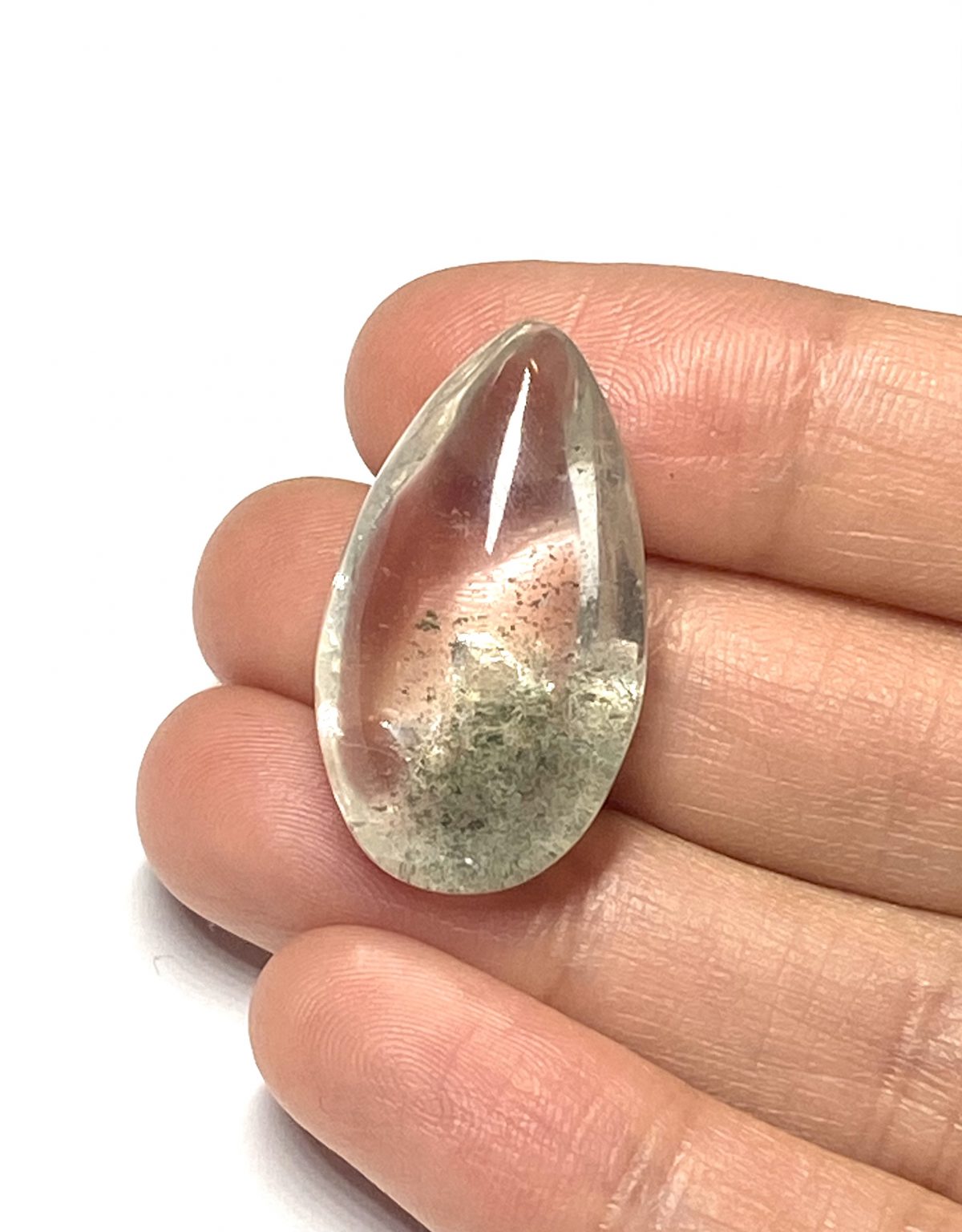 This Green Chlorite in Quartz teardrop features a polished, smooth surface that emphasizes the natural inclusions within the clear quartz. The green mineral formations create layered patterns and subtle textures, giving depth and visual complexity to the crystal. The elegant shape showcases the interplay between transparency and mineral structure, allowing light to illuminate the internal formations. Carefully selected for clarity and internal character, this handcrafted teardrop is ideal for collectors, jewellery, or display. Its combination of polished craftsmanship and visible chlorite patterns highlights the beauty of natural quartz while providing a versatile, refined piece suitable for a variety of uses.