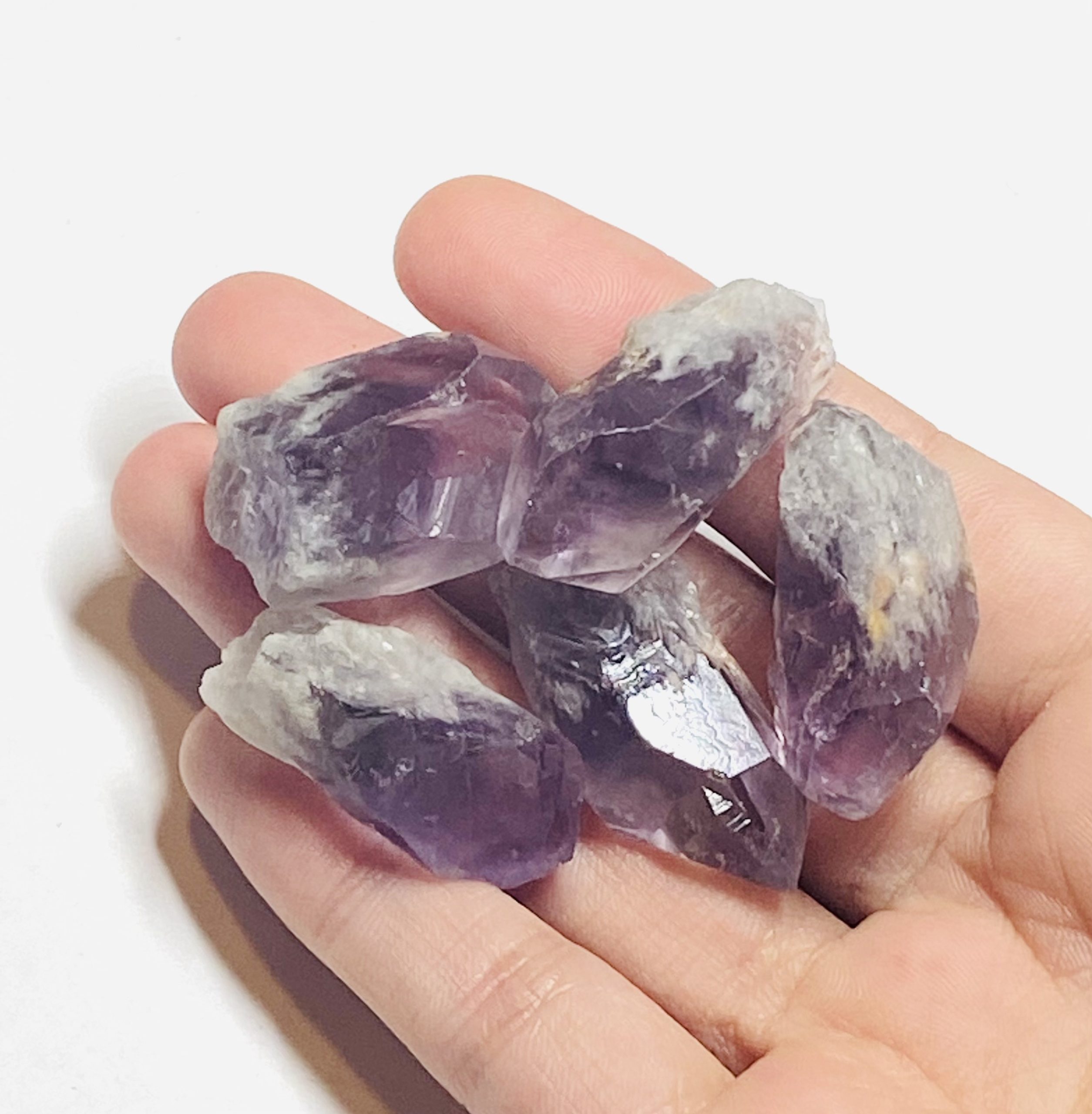 Brazilian Phantom Amethyst Quartz points with mountain peak phantom inclusions. Raw crystals ideal for meditation, crystal grids, zen gardens, and display.