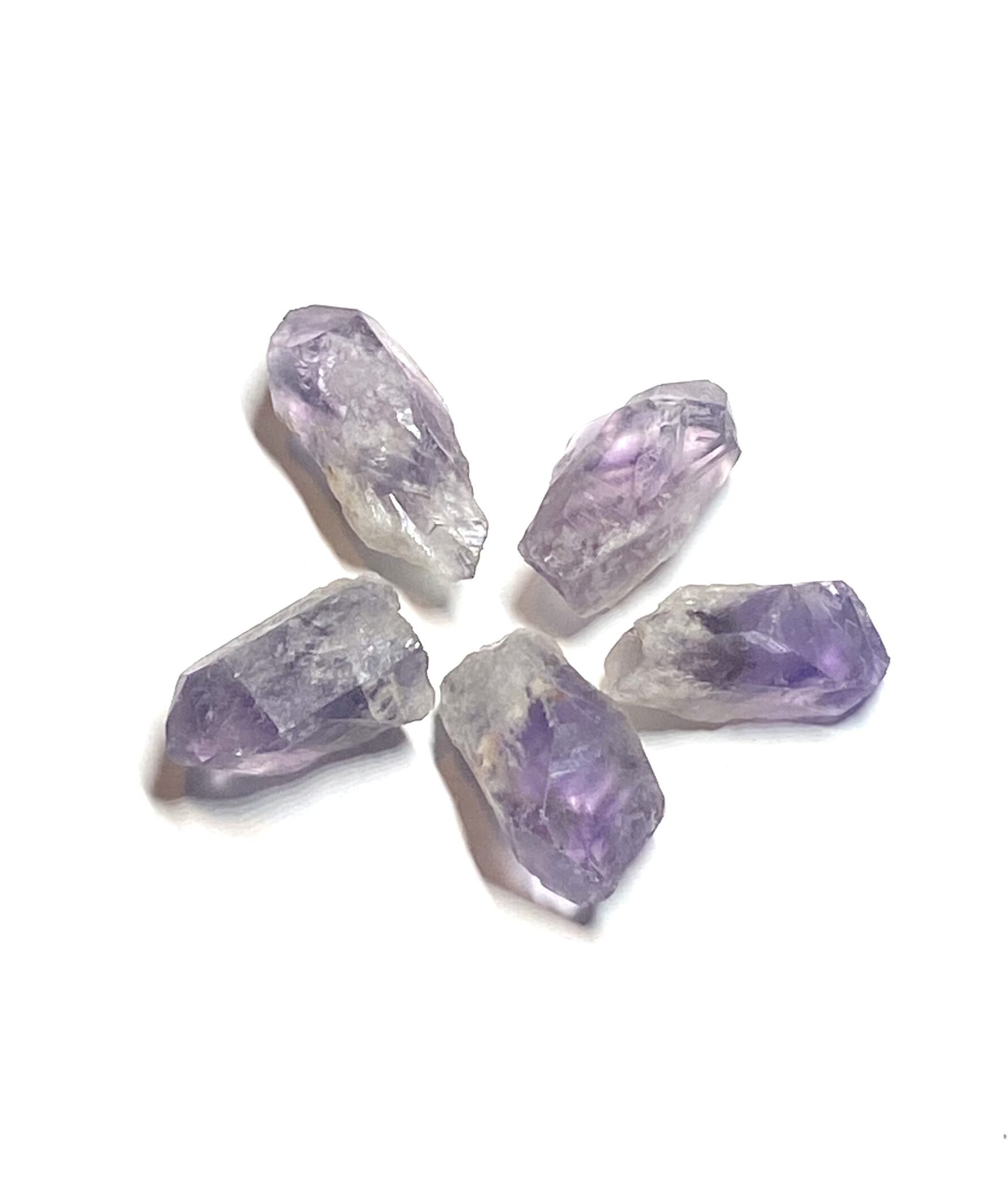 These Brazilian Phantom Amethyst Quartz points are raw, naturally formed crystals with visible phantom mountain peak inclusions inside the transparent amethyst. Each point showcases subtle internal layers that capture the stone’s growth over time, giving depth and visual interest to every specimen. The rich purple tones combined with the phantom formations make these points striking additions to any collection or display. Small yet impactful, these crystals are ideal for meditation practices, crystal grids, display, zen gardens, or decorative arrangements. Each point varies in size, colour intensity, and internal pattern, making each piece distinct. Carefully selected for clarity and formation, these Phantom Amethyst Quartz points highlight the natural beauty of amethyst while emphasizing the layered structure that defines Phantom Quartz. Their raw surfaces with naturally polished points preserve the authenticity of the crystal while allowing light to accentuate the phantom inclusions.
