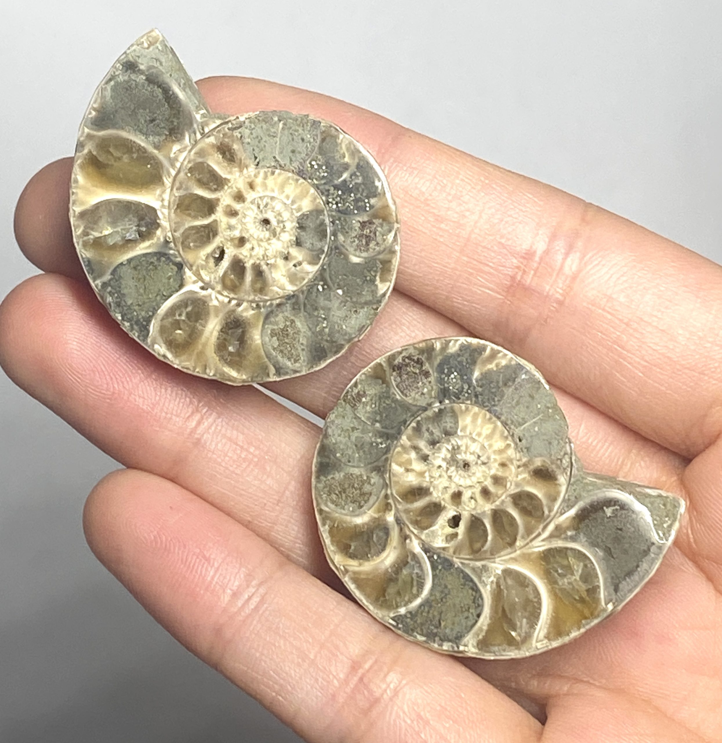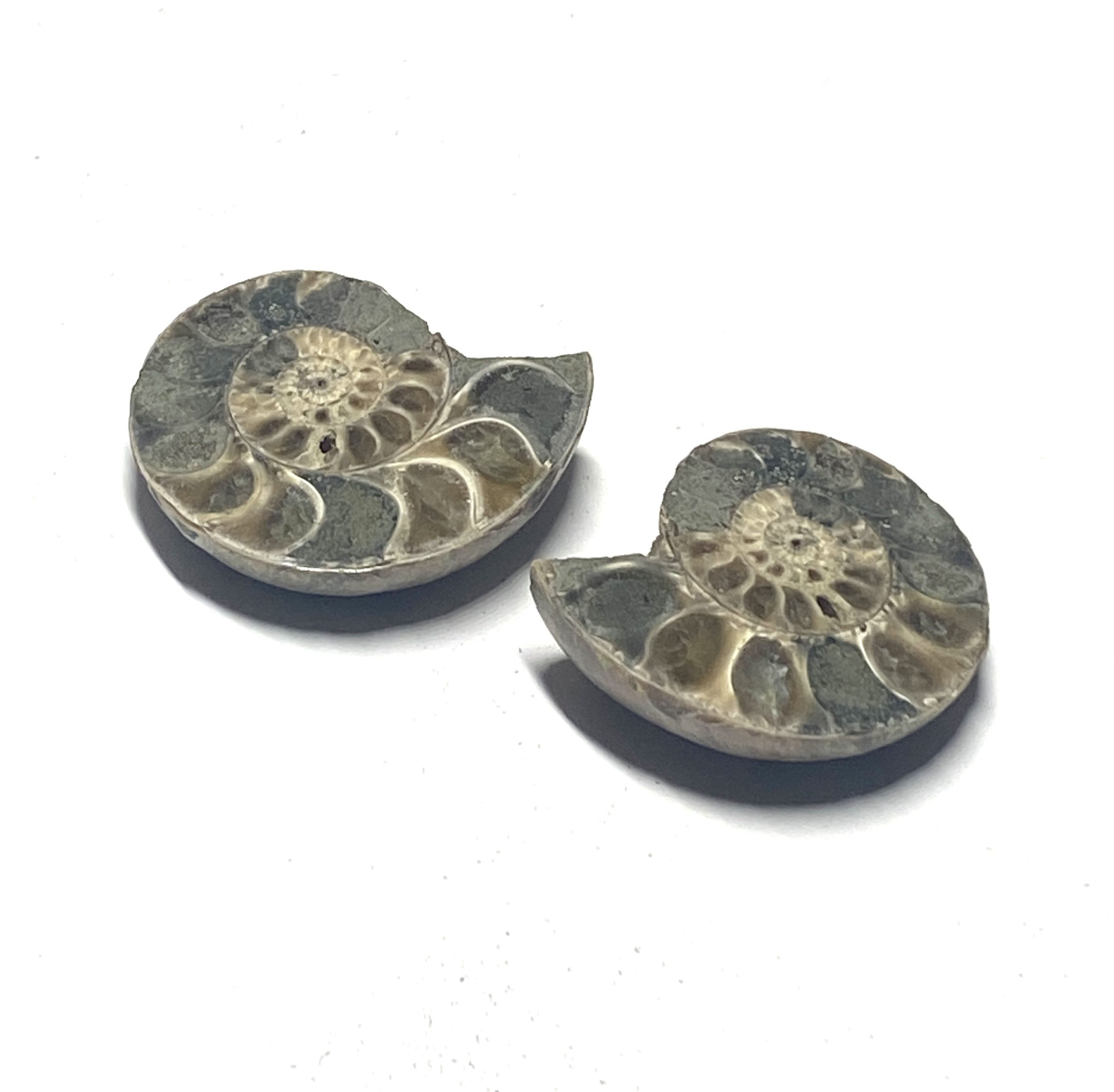 Authentic Natural Polished Cut Ammonite fossil set with spiral structure and fossilized detail. Perfect for collectors, display, or educational purposes.