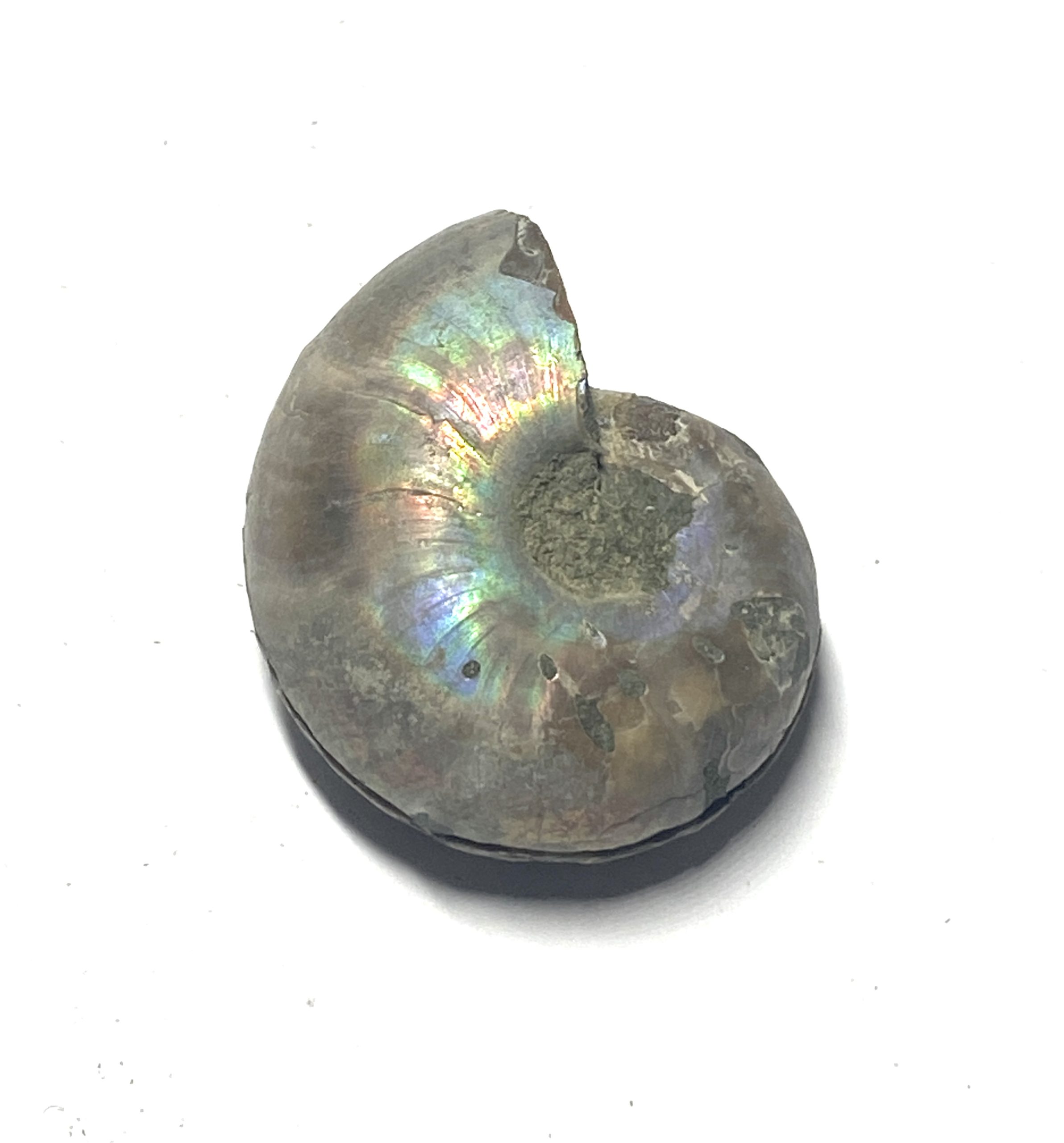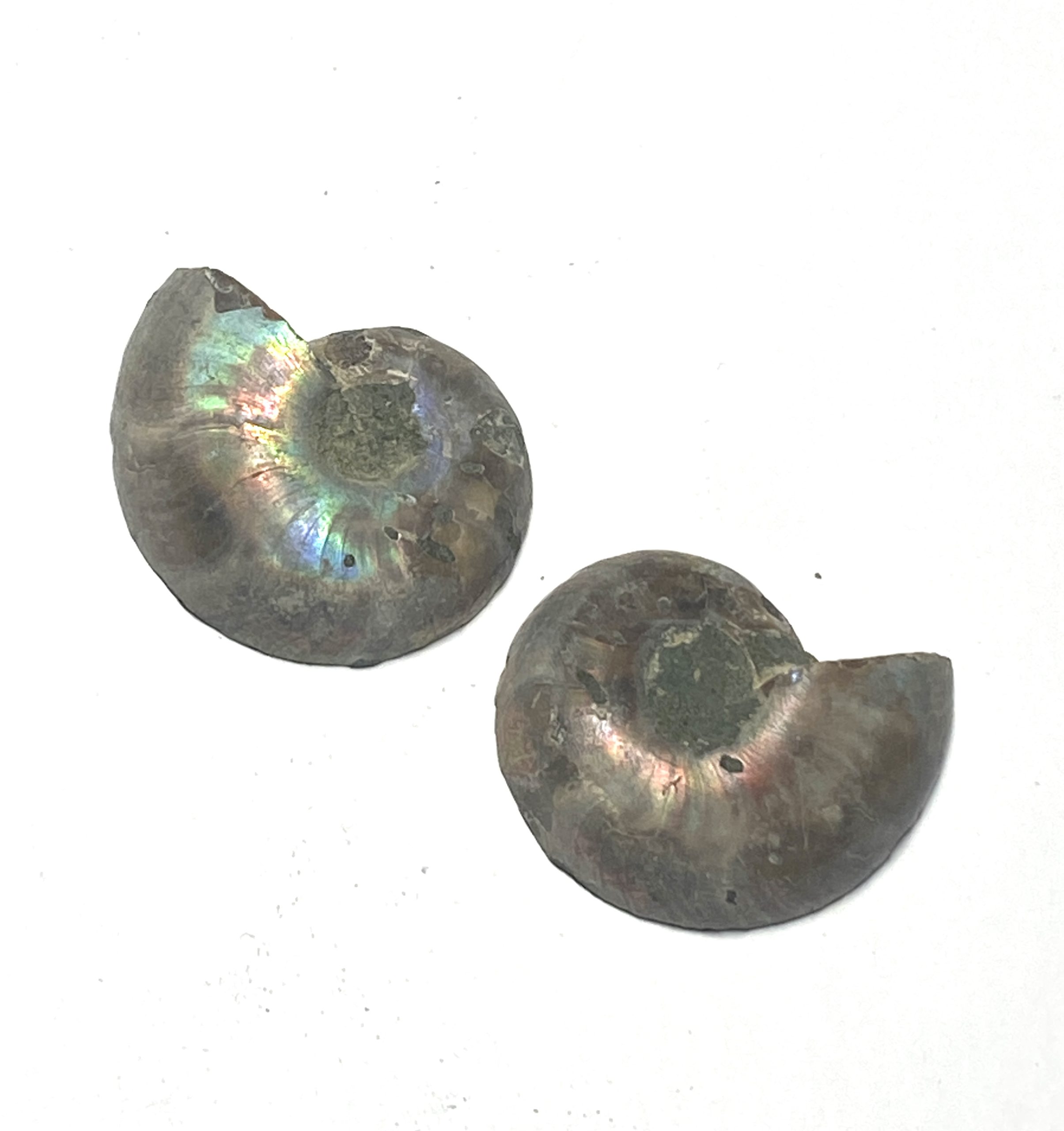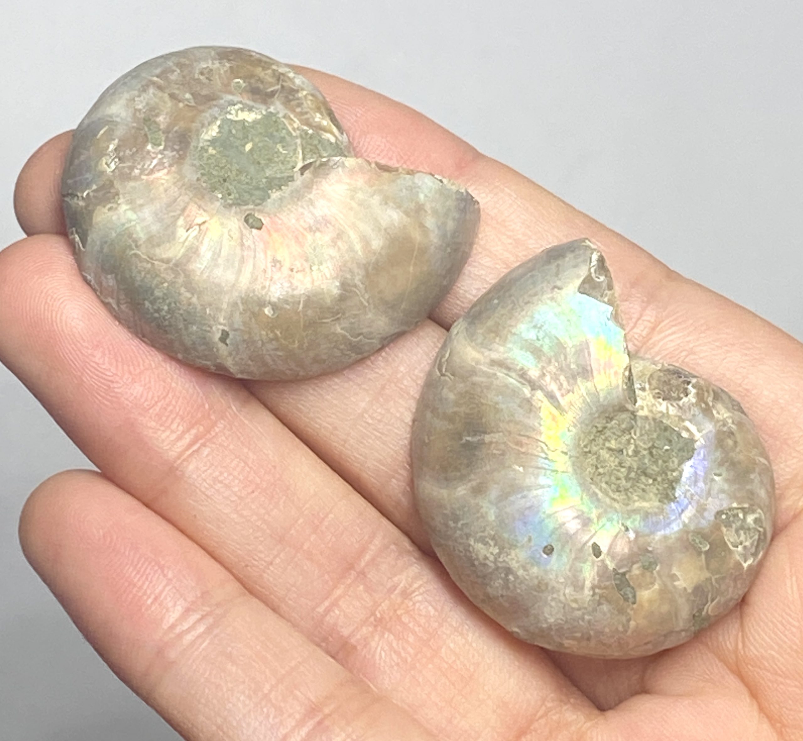 Discover this beauty! A polished cut Ammonite fossil set that showcases the intricate spiral structure preserved over millions of years. This fossil is unique in pattern and texture that highlights its ancient origin. This piece has a natural rainbow sheen on the outer surface, making it a visually striking specimen on both sides. Polished to preserve the delicate internal fossilization process while offering a durable and captivating object for collection or display. This polished cut Ammonite fossil set provides a tangible connection to prehistoric marine life and serve as an impressive addition to mineral collections, museum-style displays, or educational settings.
