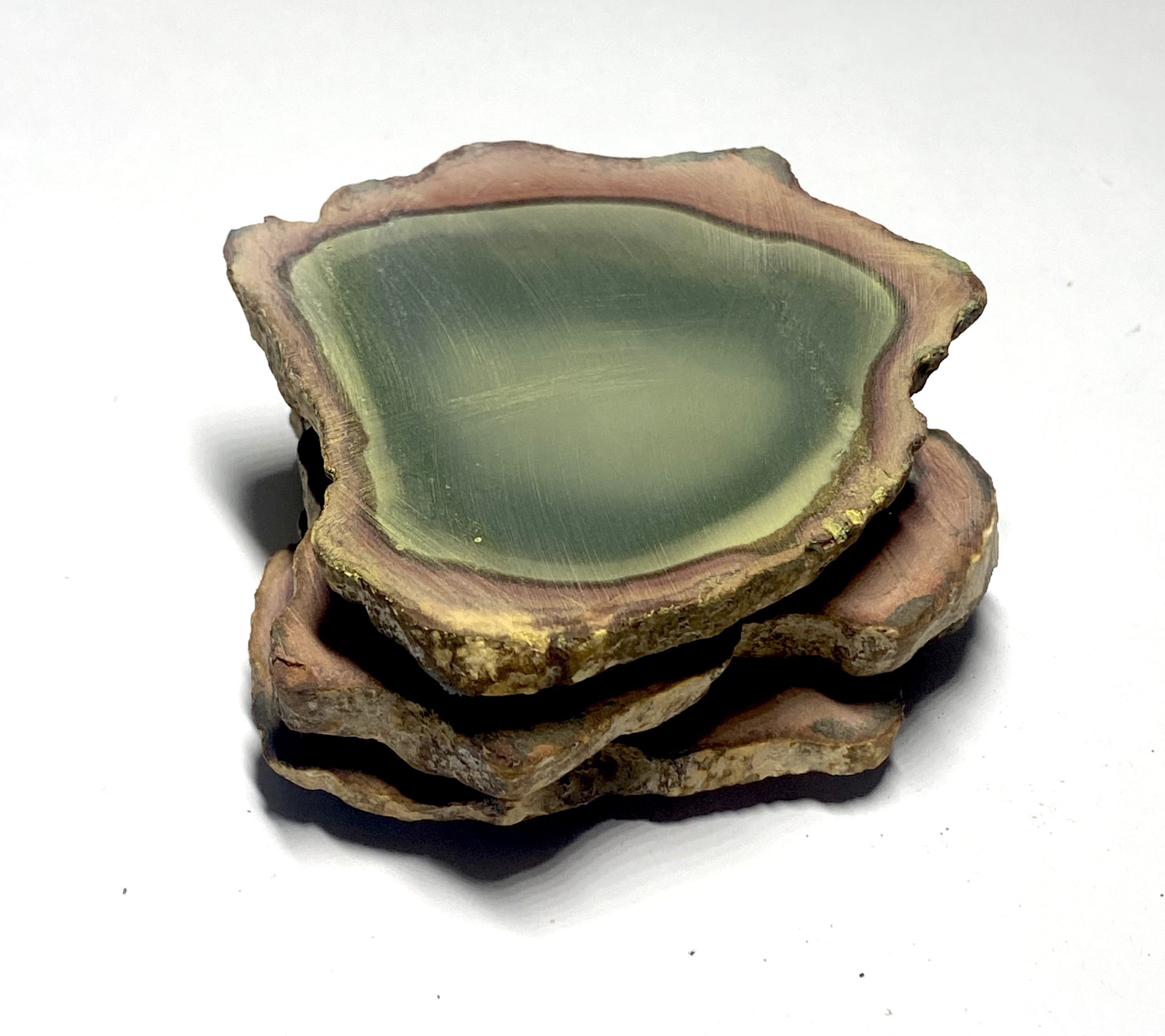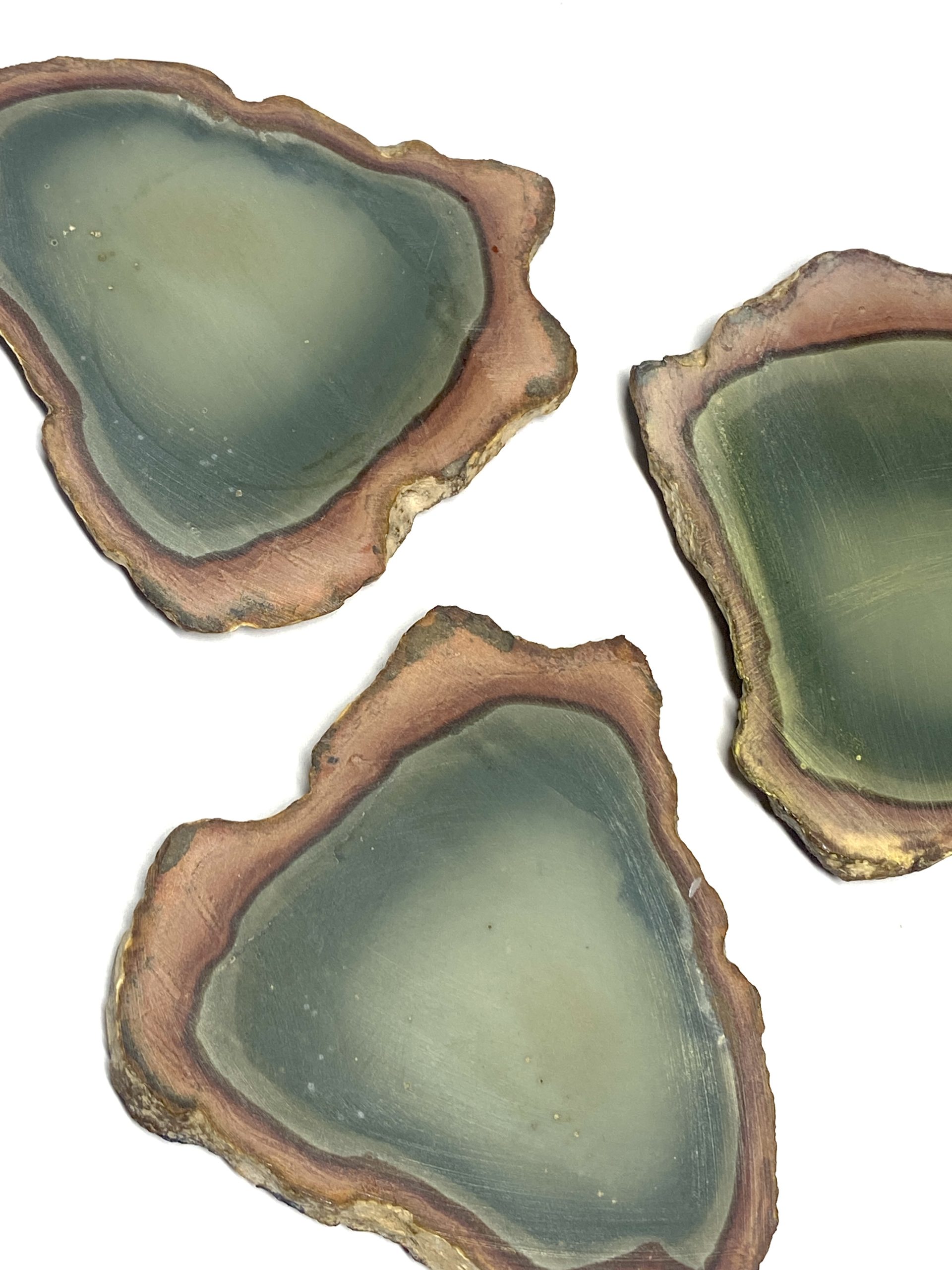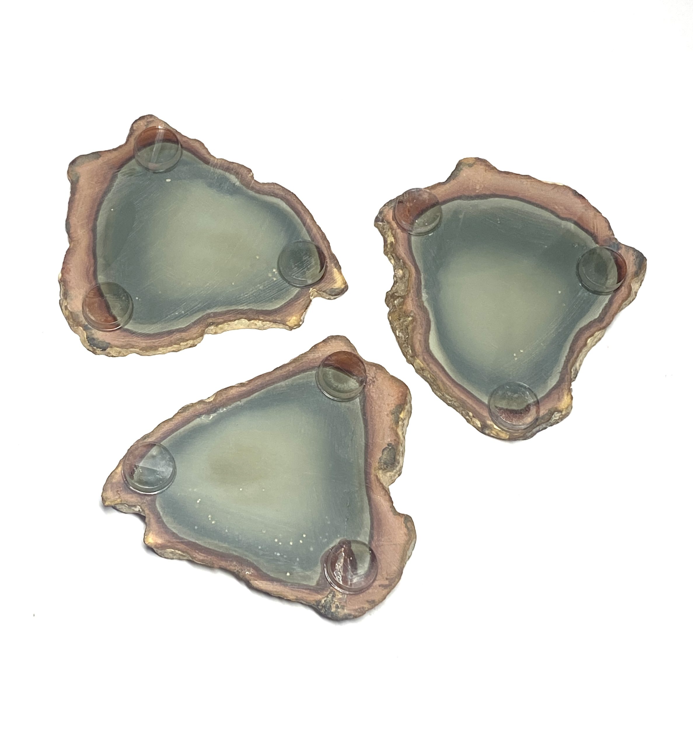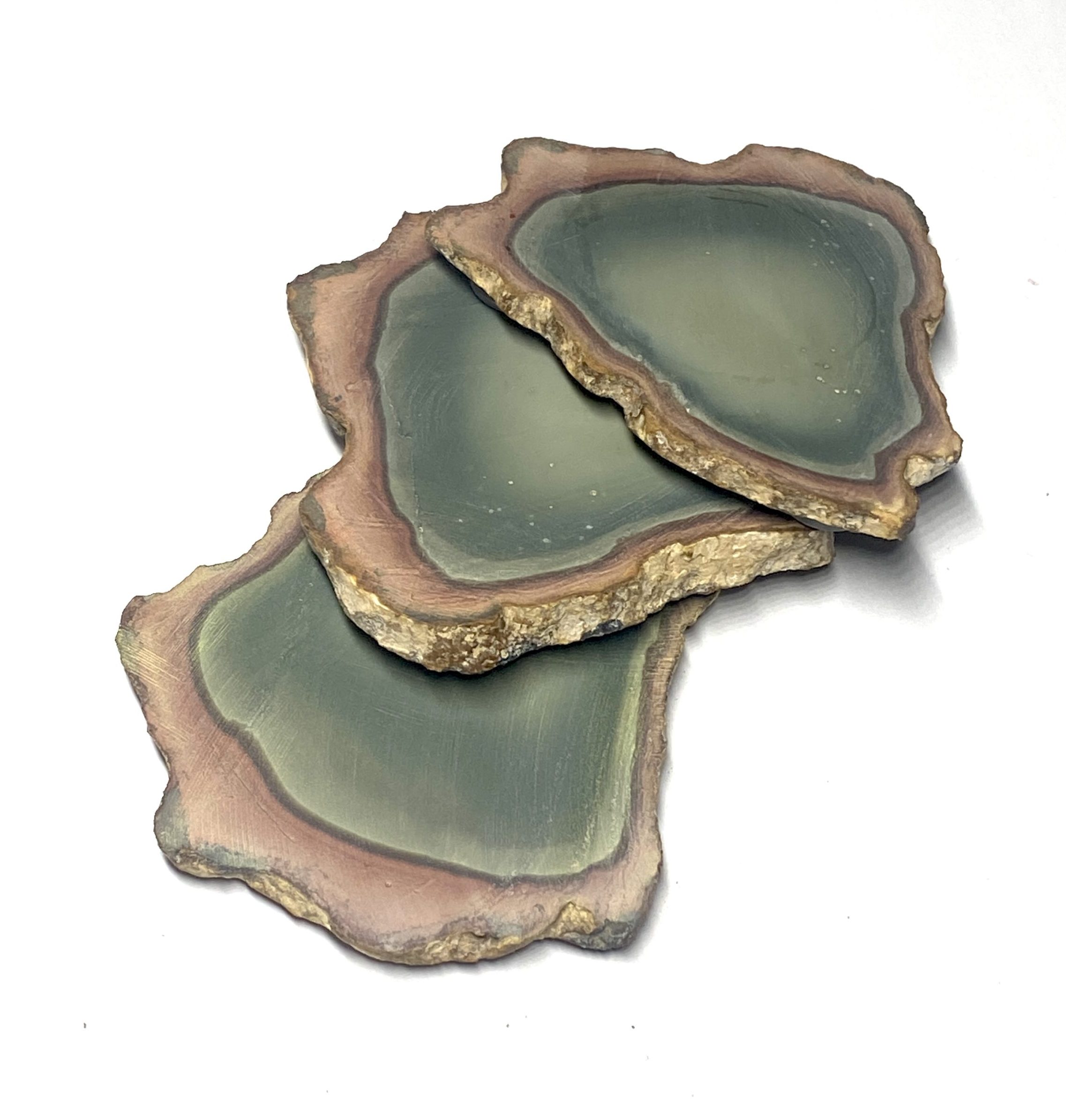 This very rare, one of a kind Polychrome Jasper coaster set features natural multi-colour patterning with warm earth hues. Each piece is cut into a smooth, even surface while preserving the stone’s distinctive colour transitions. The result is a three piece set that combines functional design with strong visual character. The unpolished surfaces with rough edging enhances the natural stone. Each coaster presents a different arrangement of thickness, offering variation across the set while maintaining a cohesive overall look. Clear silicone pads are adhered to the bottom of each coaster’s three corners.