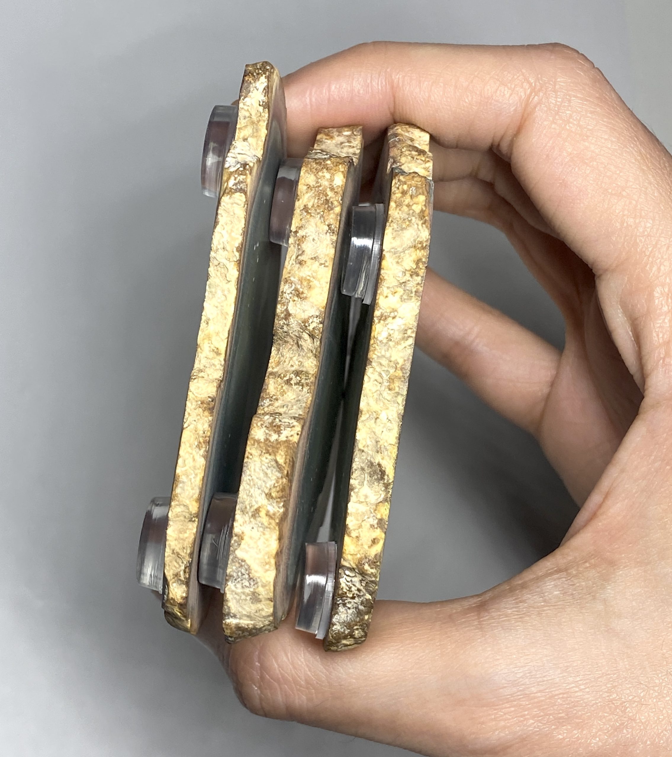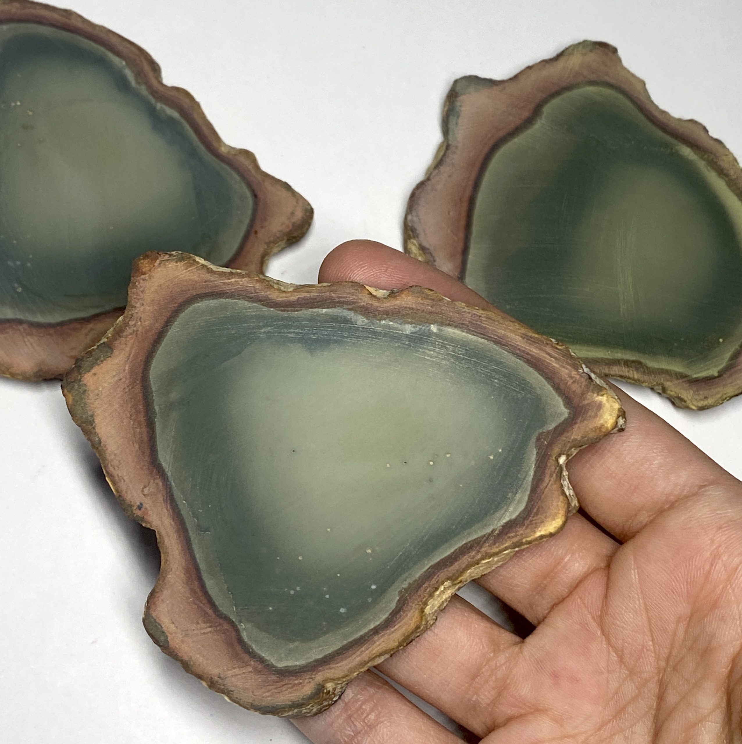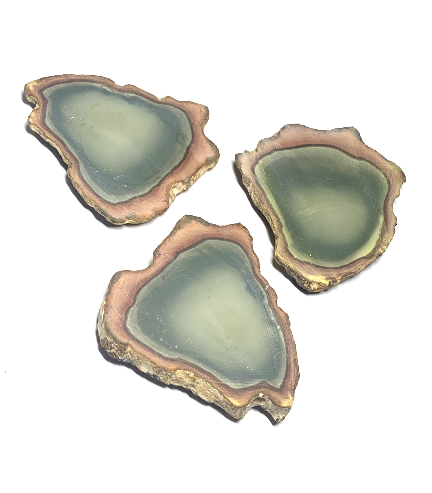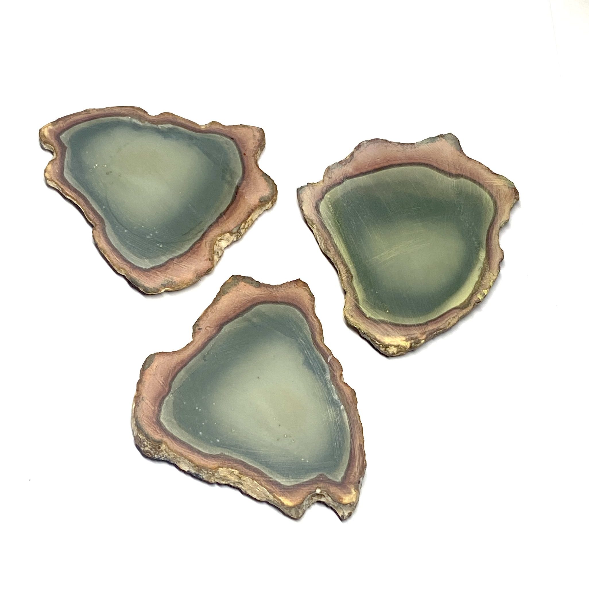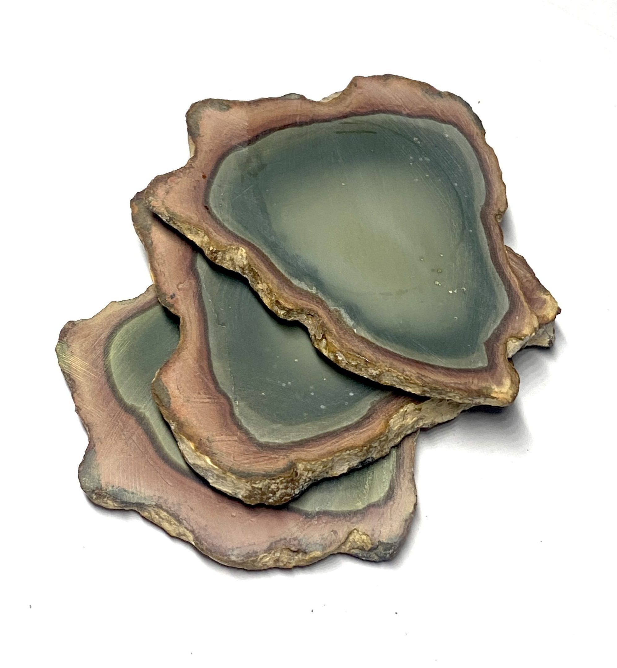 This very rare, one of a kind Polychrome Jasper coaster set features natural multi-colour patterning with warm earth hues. Each piece is cut into a smooth, even surface while preserving the stone’s distinctive colour transitions. The result is a three piece set that combines functional design with strong visual character. The unpolished surfaces with rough edging enhances the natural stone. Each coaster presents a different arrangement of thickness, offering variation across the set while maintaining a cohesive overall look. Clear silicone pads are adhered to the bottom of each coaster’s three corners.