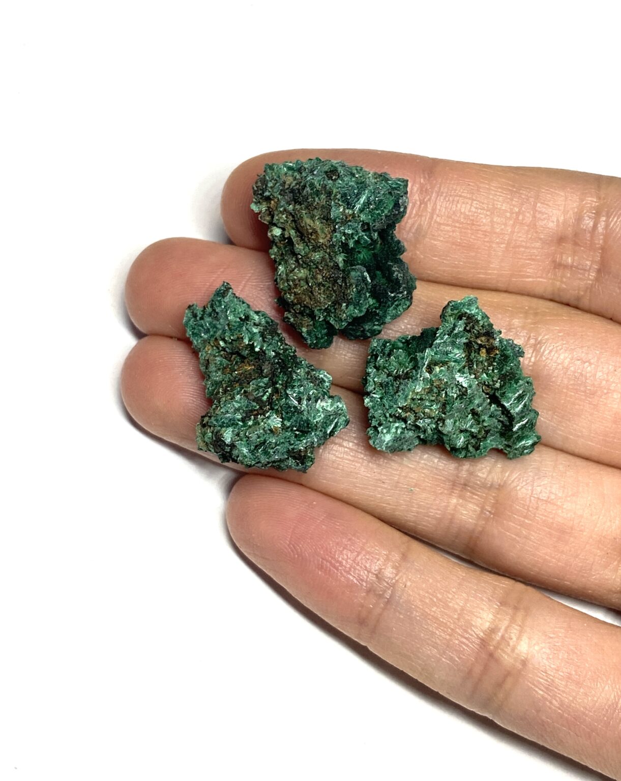 Discover Raw Malachite clusters. These beautiful minerals are a copper carbonate hydroxide mineral known for its vivid green colour and distinctive banded or striated patterns. These form naturally through variations in copper concentration during the mineral’s growth, creating layered designs that range from light to deep emerald green. The raw, unpolished surface preserves Malachite’s natural texture, structure, and growth features, offering an authentic look. Malachite forms alongside minerals such as azurite and chrysocolla. Its high copper content gives it both its intense colour and its characteristic surface patterns. Each specimen varies in shape, banding, and colour saturation, making every piece visually distinct. These raw Malachite clusters are well suited for mineral collections. The bold colour, natural banding, and geological significance make them standout masterpieces.
