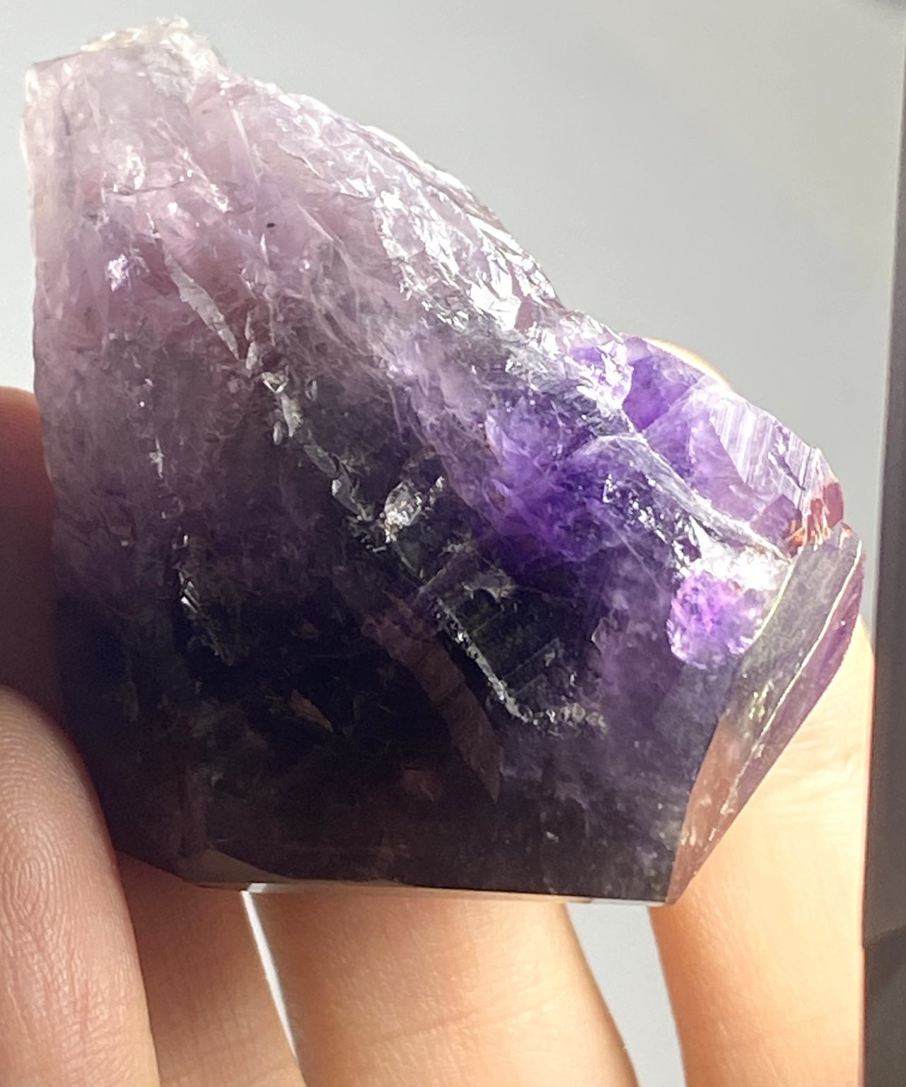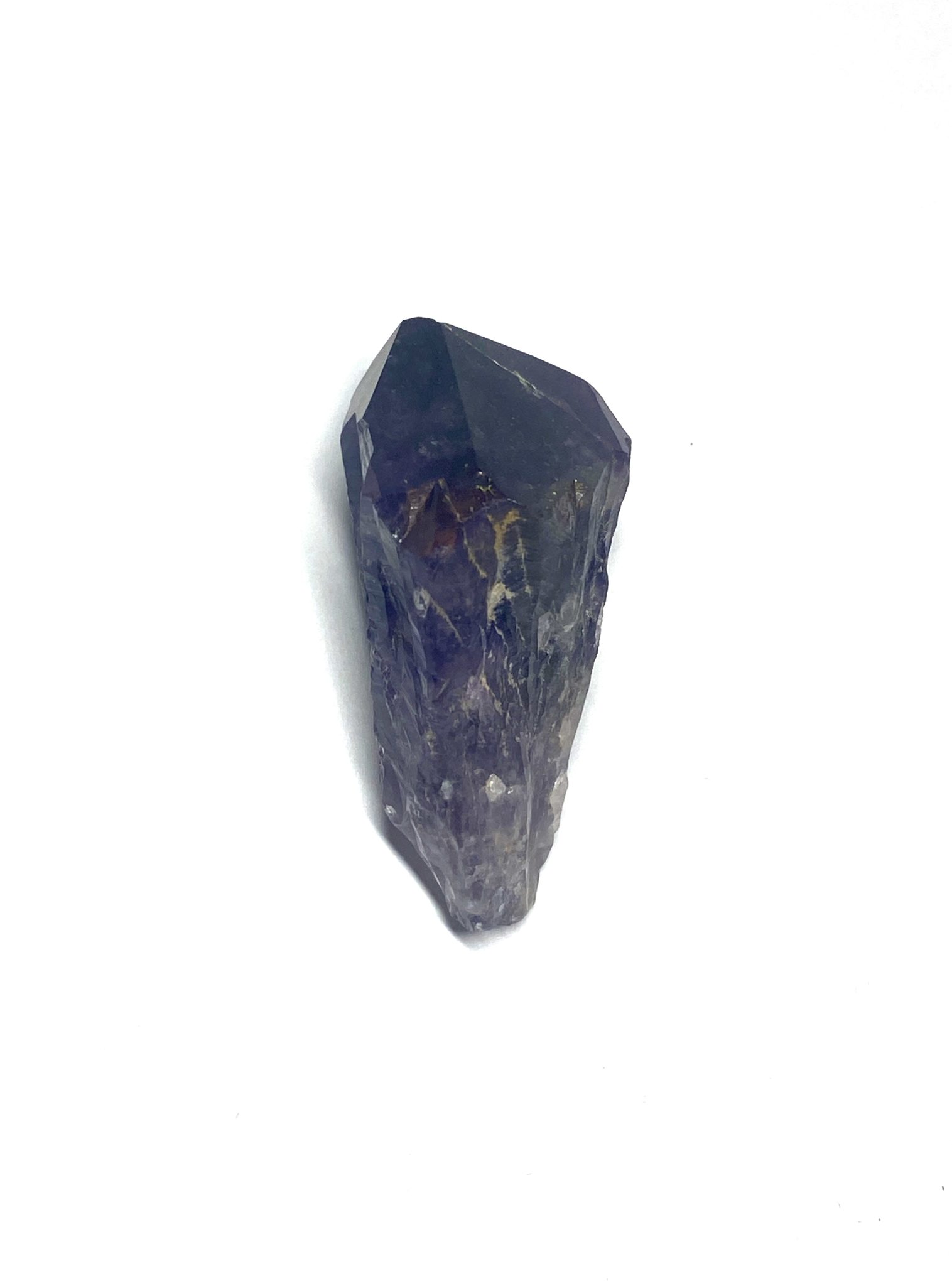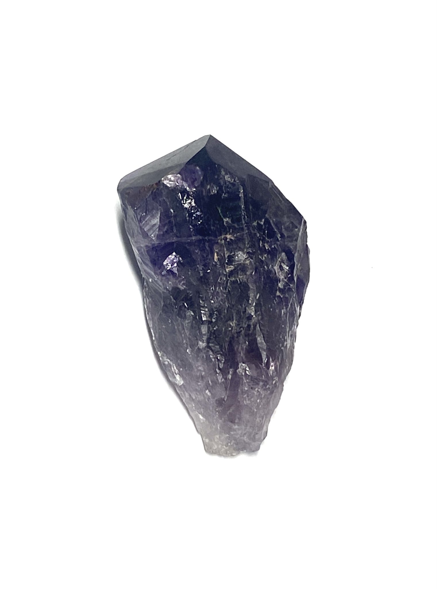 Raw Purple Amethyst point with deep colour, defined terminations, and visible Lemurian striations. Polished point, perfect for collections or display.