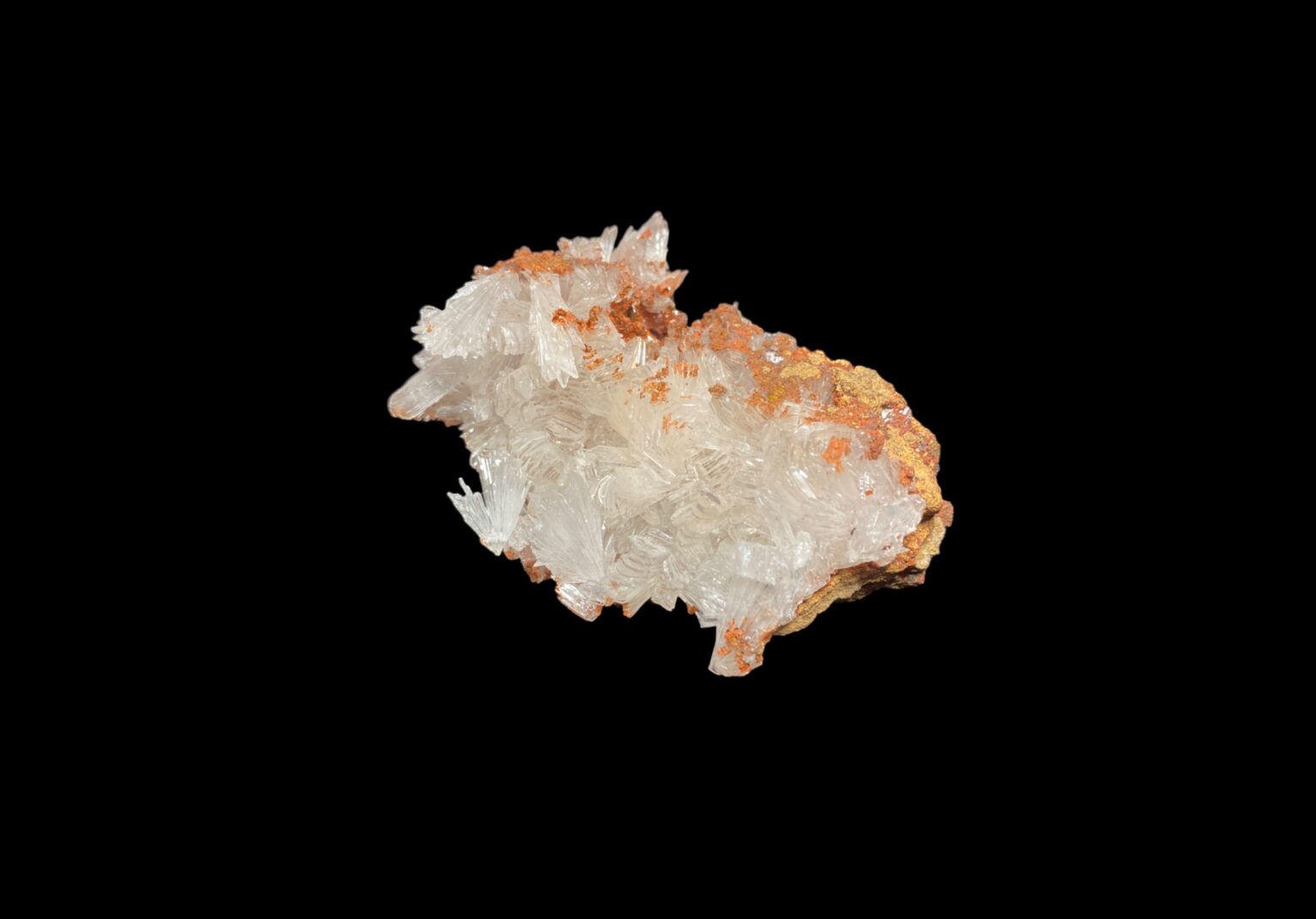 This Scolecite mineral cluster features naturally formed crystal groupings with fine, needle-like structures that radiate outward from the base. The pale white to translucent crystals create a delicate, textured appearance that highlights the mineral’s natural growth habit. Scolecite is a calcium aluminium silicate mineral belonging to the zeolite group, forming in volcanic environments through low-temperature hydrothermal processes. These geological conditions produce its characteristic fibrous crystal structure and lightweight composition. The raw, unpolished surface preserves the integrity of the crystal growth, allowing the natural patterns and structure to remain clearly visible.